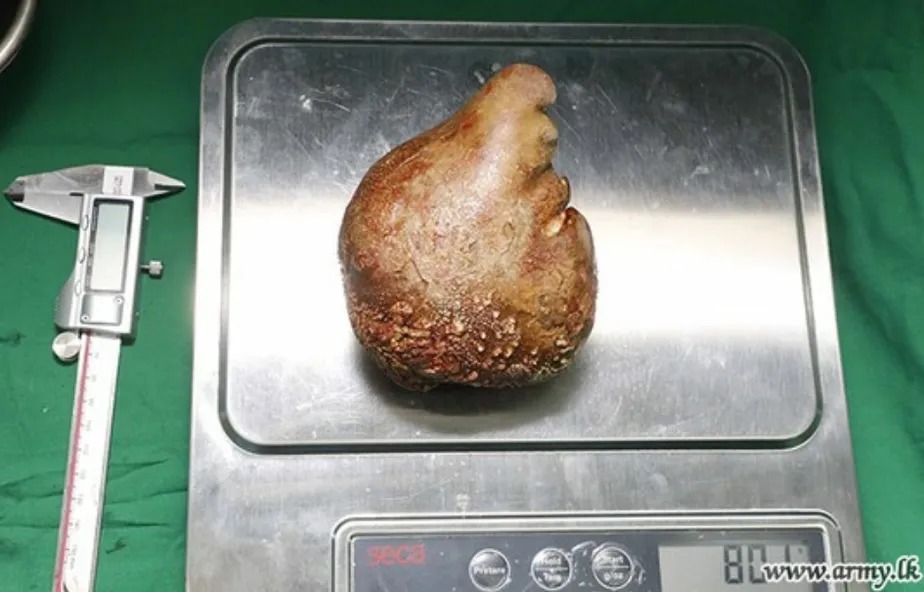 No início do mês, médicos militares no Sri Lanka identificaram e removeram a maior pedra renal do mundo. A substância tem aproximadamente 800 gramas, o que é mais de cinco vezes o peso médio de um rim masculino. O paciente é um soldado aposentado de 62 anos, conforme relatado pelo exército do país.