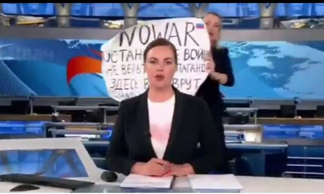 Em meio a uma dura onda de repressão a pessoas que se manifestam contra a invasão russa na Ucrânia, uma mulher invadiu o estúdio de um jornal na principal emissora de TV na Rússia em um ato contra a guerra. Identificada como Marina Ovsyannikova, uma redatora que trabalha no próprio Canal Um, ela entrou no estúdio com um cartaz onde se liam frases como “não acreditem na propaganda” e “eles estão mentindo para vocês”. O microfone da apresentadora ainda captou seus gritos de “parem a guerra”.