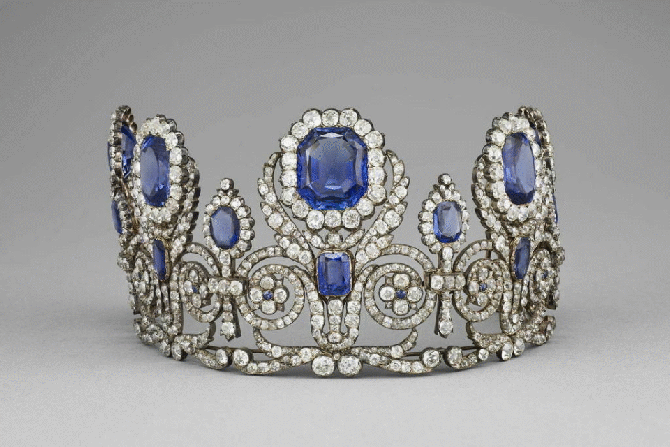 Tiara de safiras das rainhas Hortênsia e Maria Amélia – contém 24 safiras e mais de mil diamantes: