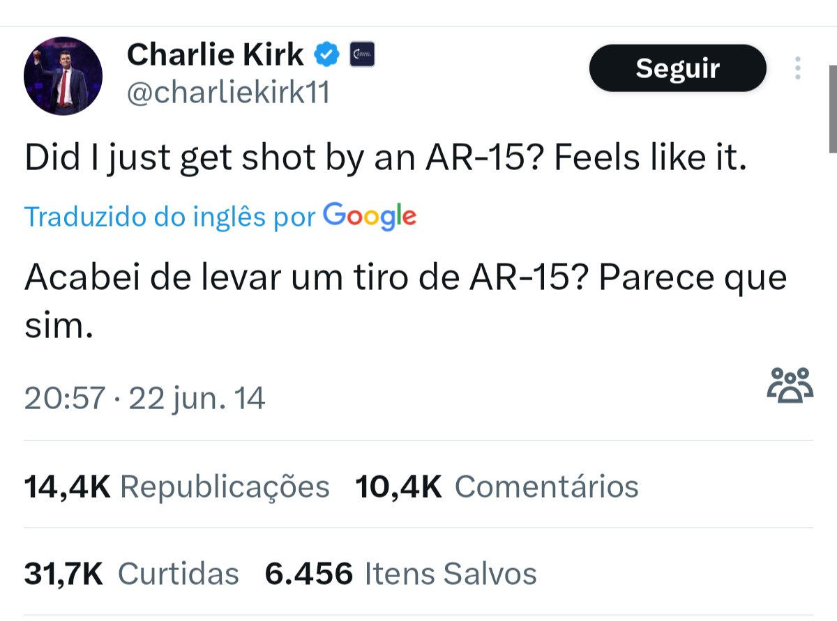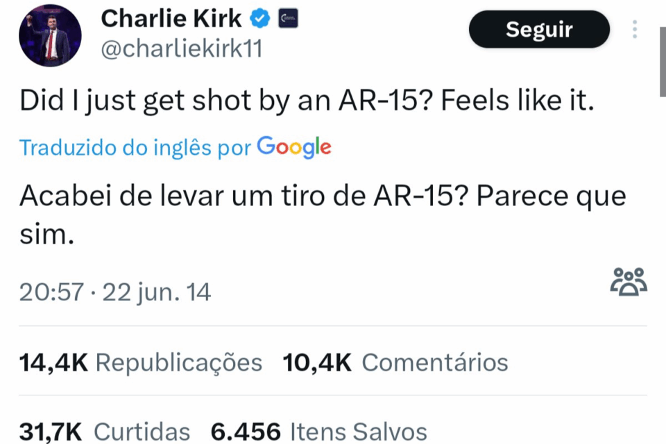 Um tuíte de Charlie Kirk feito em 2014 voltou a circular nas redes sociais após a morte do ativista de extrema-direita, baleado durante um evento em universidade em Utah (EUA), na quarta-feira (10/9). O post enigmático chamou a atenção porque, mais de uma década antes do crime, já mencionava um disparo de arma de fogo — o que fez muitos internautas falarem em “profecia” e “premonição”.