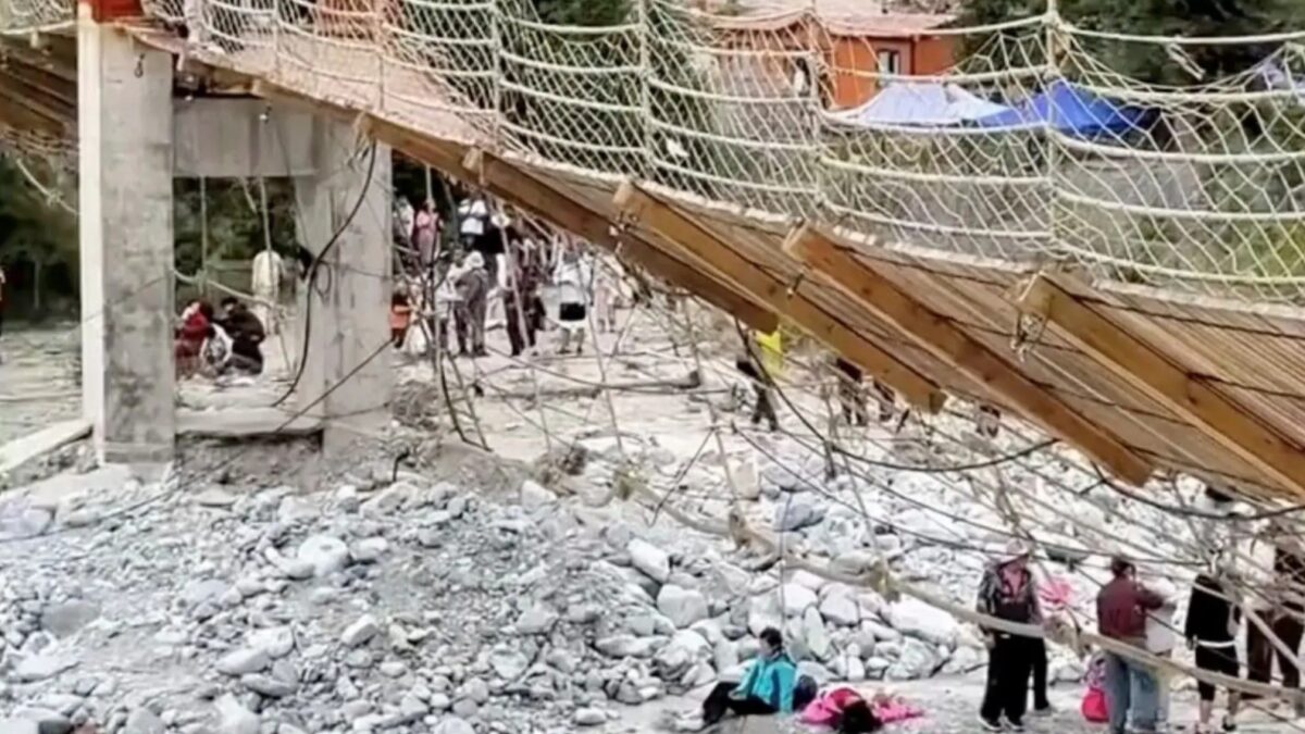 Vídeos que circulam nas redes sociais mostram a ponte inclinada, com os cabos laterais soltos e pendendo entre a estrutura e o solo. Parte da estrutura fica suspensa sobre um rio.
