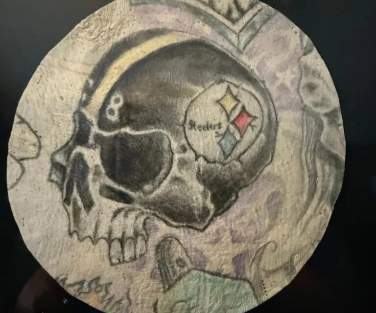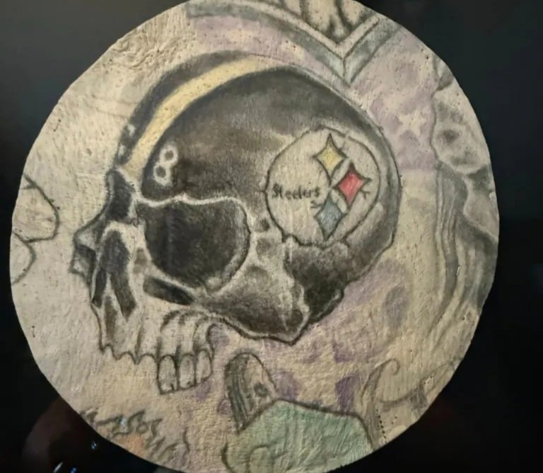 Após a morte do marido, Angelica Radevski decidiu cortar a pele com tatuagem do marido morto e a emoldurar em homenagem. O marido, TJ, faleceu em março deste ano, aos 55 anos, na Virgínia Ocidental, nos Estados Unidos. A tatuagem escolhida foi a primeira que ele fez: um capacete do Pittsburgh Steelers transformado em caveira, nas cores preto e dourado.