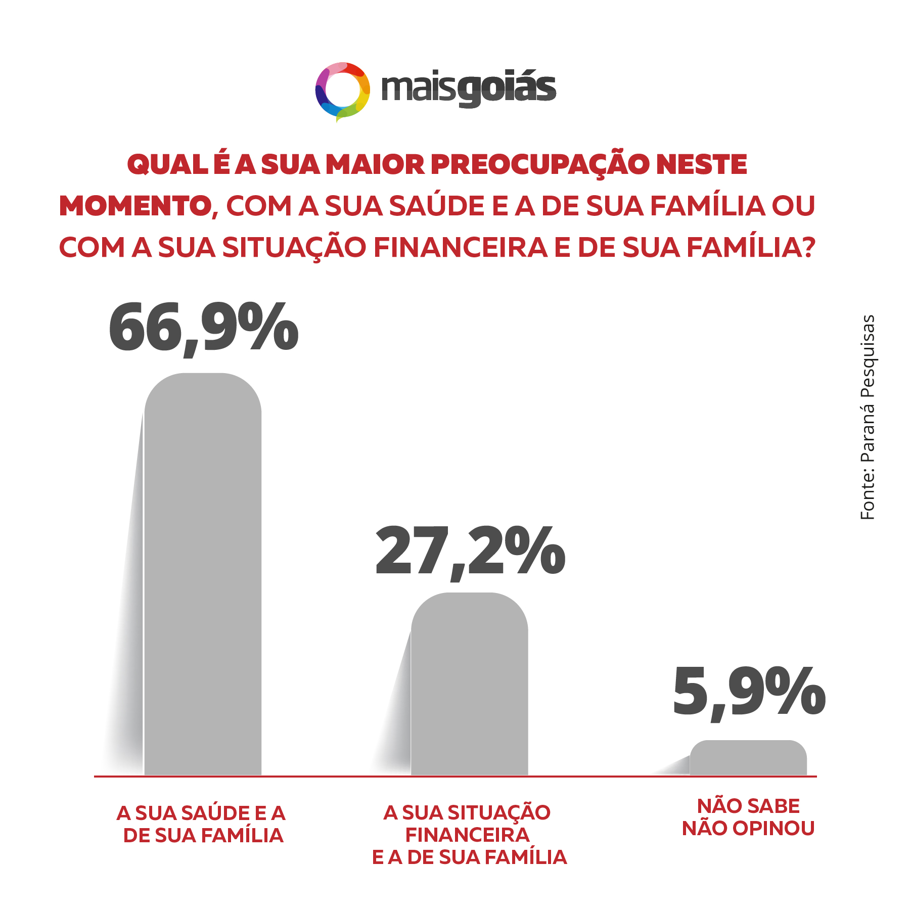 Como resultado, 66,9% dos brasileiros alegaram que estão mais preocupados com a própria saúde e da família. Já para 27,2% a própria situação financeira e da família é mais preocupante. 5,9% não souberam ou não quiseram se pronunciar.
