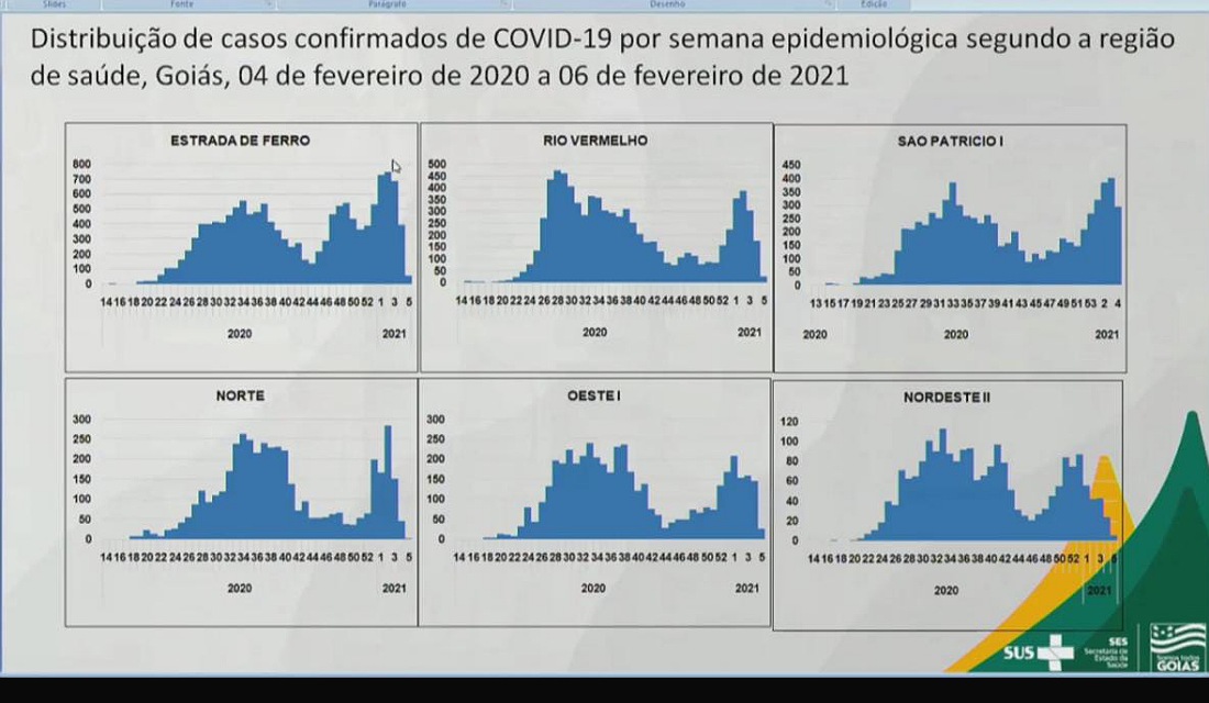 Seis das 18 regiões de atenção em Saúde de Goiás apresentam contaminação por covid-19 maior à registrada na chamada primeira onda da doença. São elas: Estrada de Ferro, Rio Vermelho, Vale do São Patrício I, Norte, Oeste I e Nordeste II (mapa). Os dados foram apresentados pela superintendente de Vigilância em Saúde, Flúvia Amorim, durante videoconferência com prefeitos realizada na manhã desta quarta-feira (17).