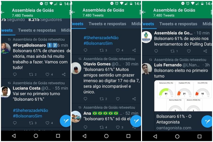 Usuários do Twitter puderam notar que o perfil da Assembleia Legislativa do Estado de Goiás (Alego) retweetou, na tarde de terça-feira (18), conteúdos pró-Jair Bolsonaro.