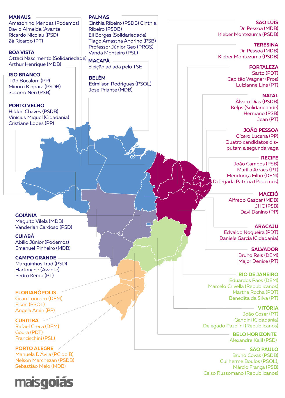 Partidos como DEM, MDB, PSDB, PSB e PSD estão entre os que têm mais chances de vencer a eleição já no primeiro turno ou levar candidatos ao 2º turno, que acontecerá em 29 de novembro. O Mais Goiás apresenta um resumo de como está as eleições nas capitais brasileiras.