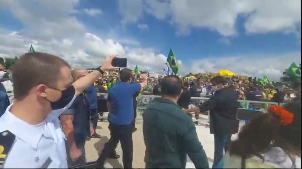 O presidente Jair Bolsonaro foi ao Palácio do Planalto no fim da manhã deste domingo para, mais uma vez, acompanhar uma manifestação em seu favor. Ele apareceu no alto da rampa do prédio às 12h12, acompanhado de alguns de seus ministros: Augusto Heleno (Gabinete de Segurança Institucional), André Mendonça (Justiça e Segurança Pulblica), Luiz Eduardo Ramos (Secretaria de Governo), Onyx Lorenzoni (Cidadania), Tereza Cristina (Agricultura), Bento Albuquerque (Minas e Energia), Jorge Oliveira (Secretaria-Geral da Presidência), Marcos Pontes (Ciência e Tecnologia), Ernesto Araújo (Relações Exteriores) e Abraham Weintraub (Educação).