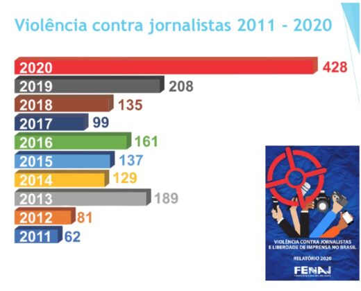 Segundo informações da Federação Nacional dos Jornalistas (Fenaj), 2020 registrou 428 casos de ataques – incluindo dois assassinatos – a jornalistas. O número é 105,77% maior que em 2019, que já tinha apresentado aumento em relação a 2018.