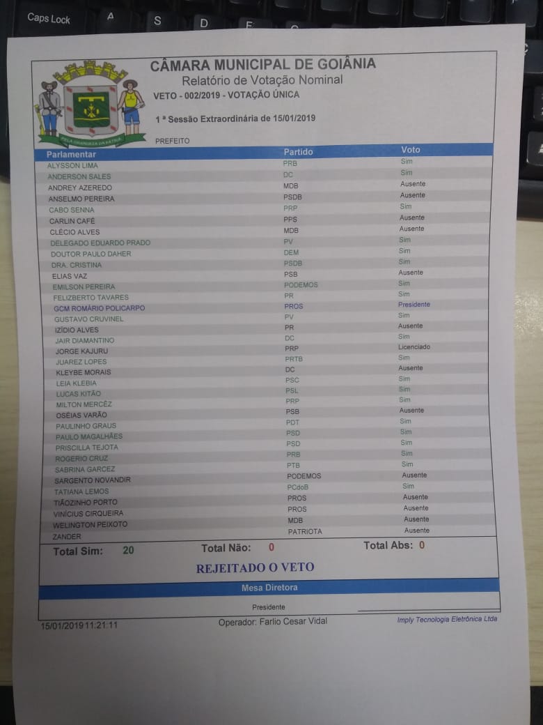 Vereadores presentes usaram a tribuna para criticar a “inconveniência” do veto e também parlamentares que se ausentaram da votação. Lucas Kitão (PSL), que assina o projeto de lei em questão ao lado de Elias Vaz (PSB) e Alysson Lima (PRB), enviou uma recomendação a Íris Rezende. “Enxuga a prefeitura que você vai ter dinheiro para tocar a administração sem terá que aumentar impostos”.