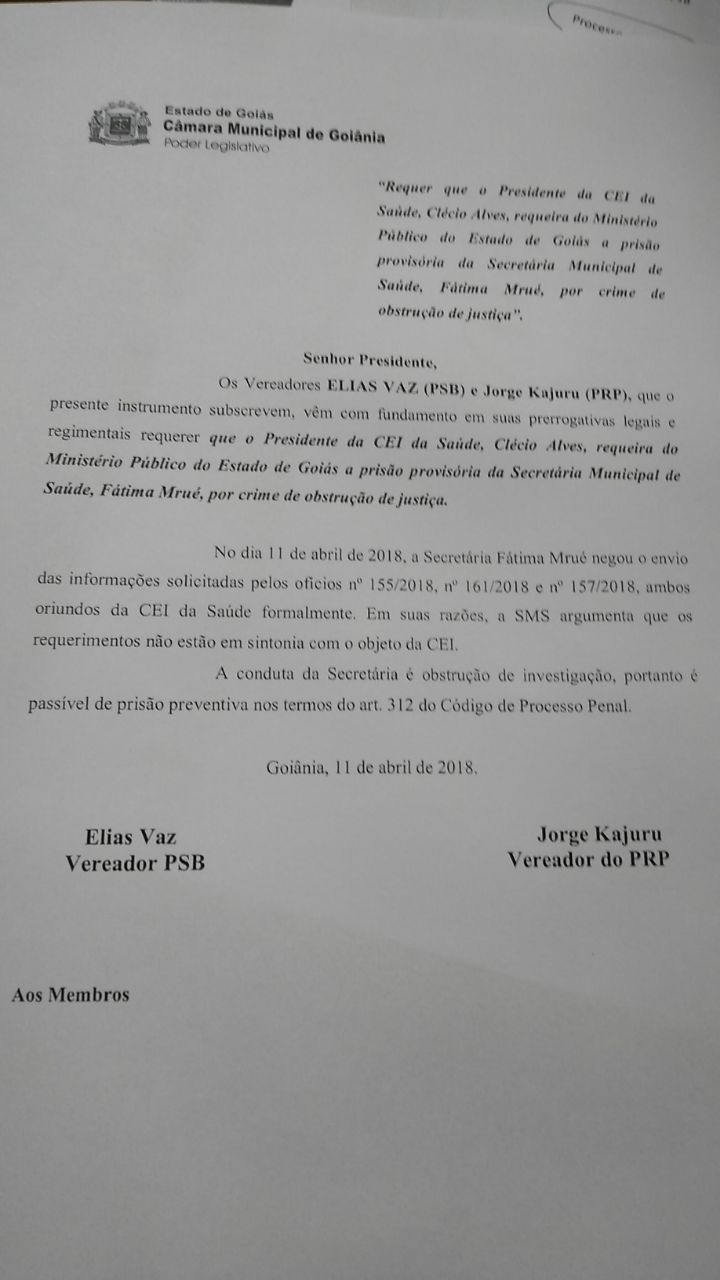A Comissão Especial de Inquérito (CEI) instalada na Câmara Municipal de Goiânia para investigar irregularidades na Saúde irá pedir ao Ministério Público a prisão preventiva da secretária da pasta Fátima Mrué. Ela é acusada pelo relator da CEI vereador Elias Vaz de obstruir as investigações. A comissão também irá solicitar um mandado de busca e apreensão de documentos relativos a três requerimentos feitos nesta quarta-feira (11) à Mrué, que se negou a atendê-los por, segundo Elias, não serem alvo de objeto da comissão.