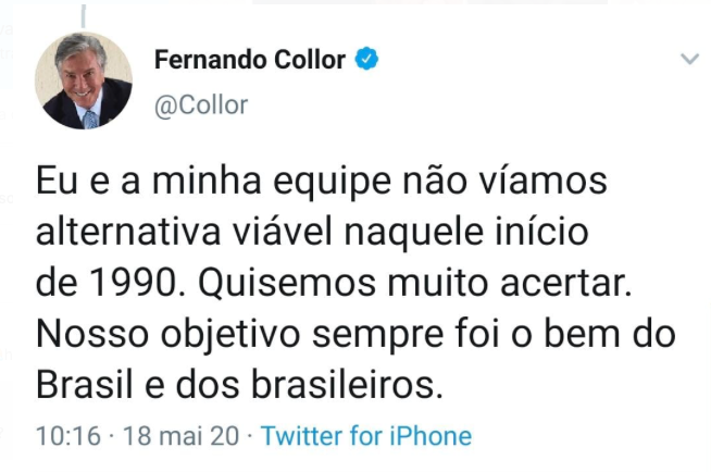 “É chegado o momento de falar, com ainda mais clareza, de um assunto delicado e importante”, escreveu o senador. “Acreditei que aquelas medidas radicais eram o caminho certo. Infelizmente errei. Gostaria de pedir perdão a todas aquelas pessoas que foram prejudicadas pelo bloqueio dos ativos”. Collor foi o primeiro presidente da América Latina a sofrer impeachment na história política do continente.