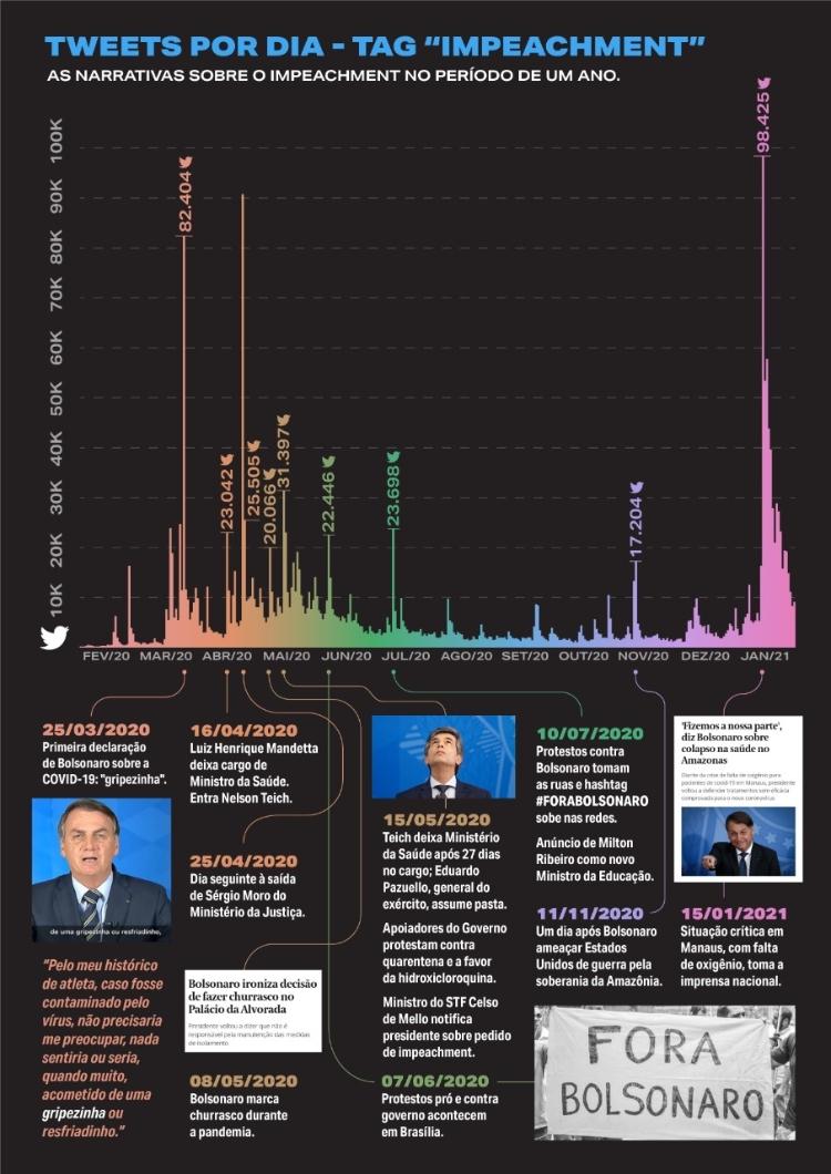 Um levantamento inédito da organização Avaaz no Twitter identificou picos de pedidos de impeachment nas redes sociais nos mesmos dias em que o presidente Jair Bolsonaro fez declarações negacionistas em relação ao enfrentamento da covid-19 ou então em momentos críticos da gestão da pandemia no Brasil, como na falta de oxigênio em Manaus, no Amazonas.