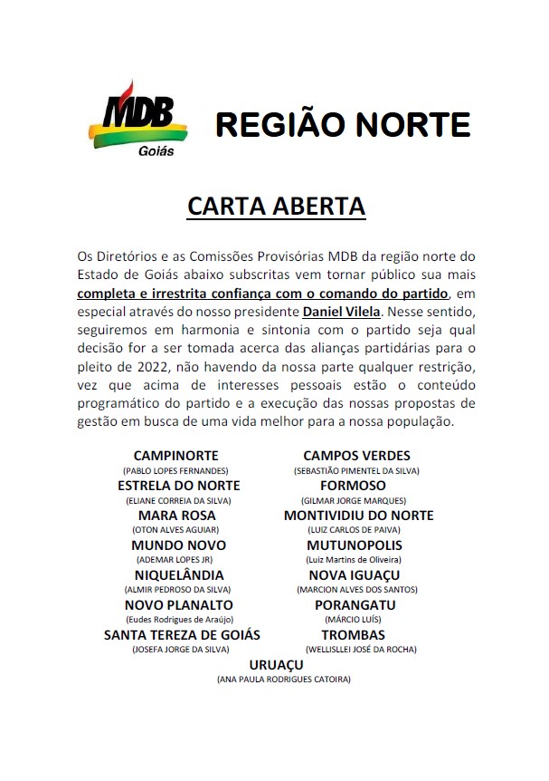 Diretórios do MDB no Norte goiano divulgaram nota em apoio a Daniel Vilela na quarta-feira (25). Com isso, a mobilização interna do partido em prol da aliança com o governo estadual se torna mais intensa.
