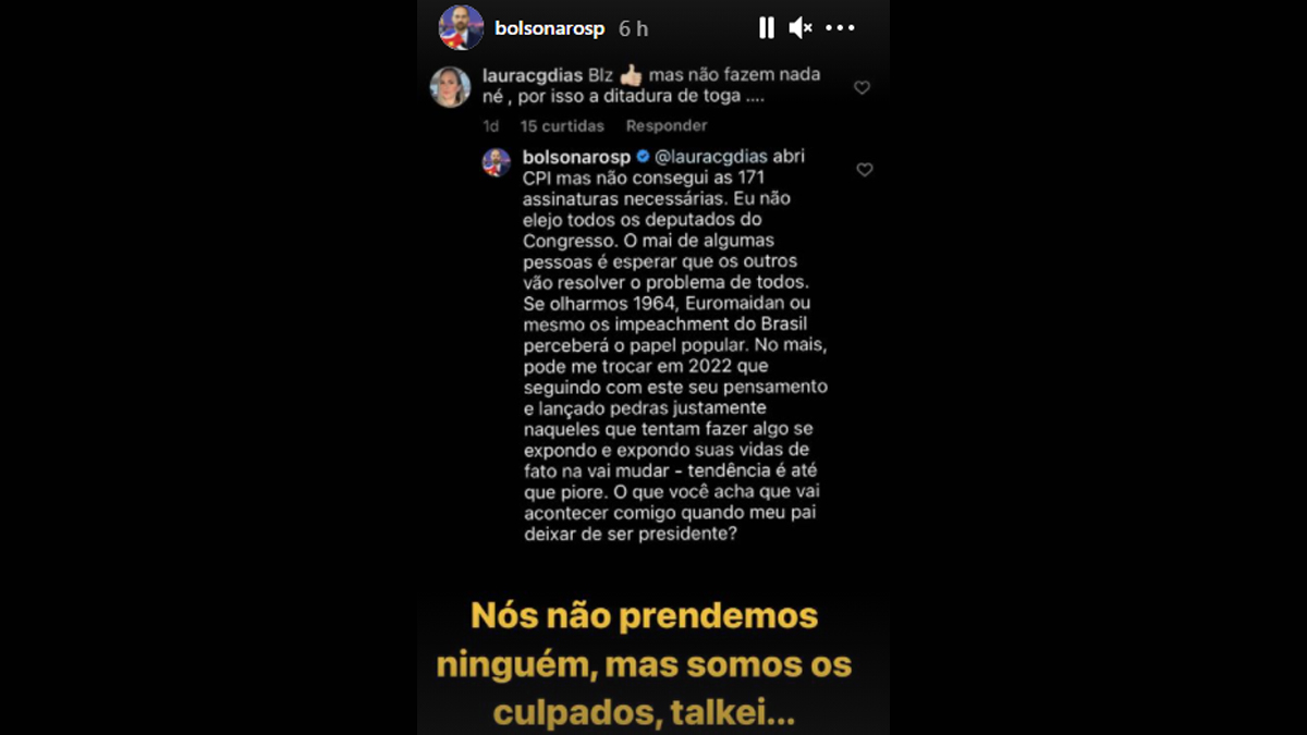 E ainda se referindo a uma seguidora que o acusou de não fazer nada disse: “No mais, pode me trocar em 2022 que seguindo com este seu pensamento e lançando pedras justamente naqueles que tentam fazer algo, se expondo e expondo suas vidas, de fato não vai mudar – tendência até que piore. O que você acha que vai acontecer comigo quando meu pai deixar de ser presidente?”