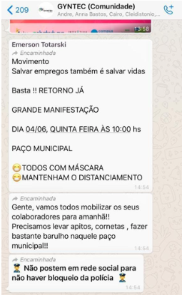 O aviso enviado por Tokarski orienta aos empresários que peçam aos seus colaboradores e funcionários que levem apitos e cornetas para “fazer barulho” no Paço. Em seguida, em negrito, uma nova mensagem diz para que os empresários não postem sobre a manifestação em redes sociais para que não haja bloqueio da polícia. E lembra também para que todos compareçam com máscara e mantenham o distanciamento.