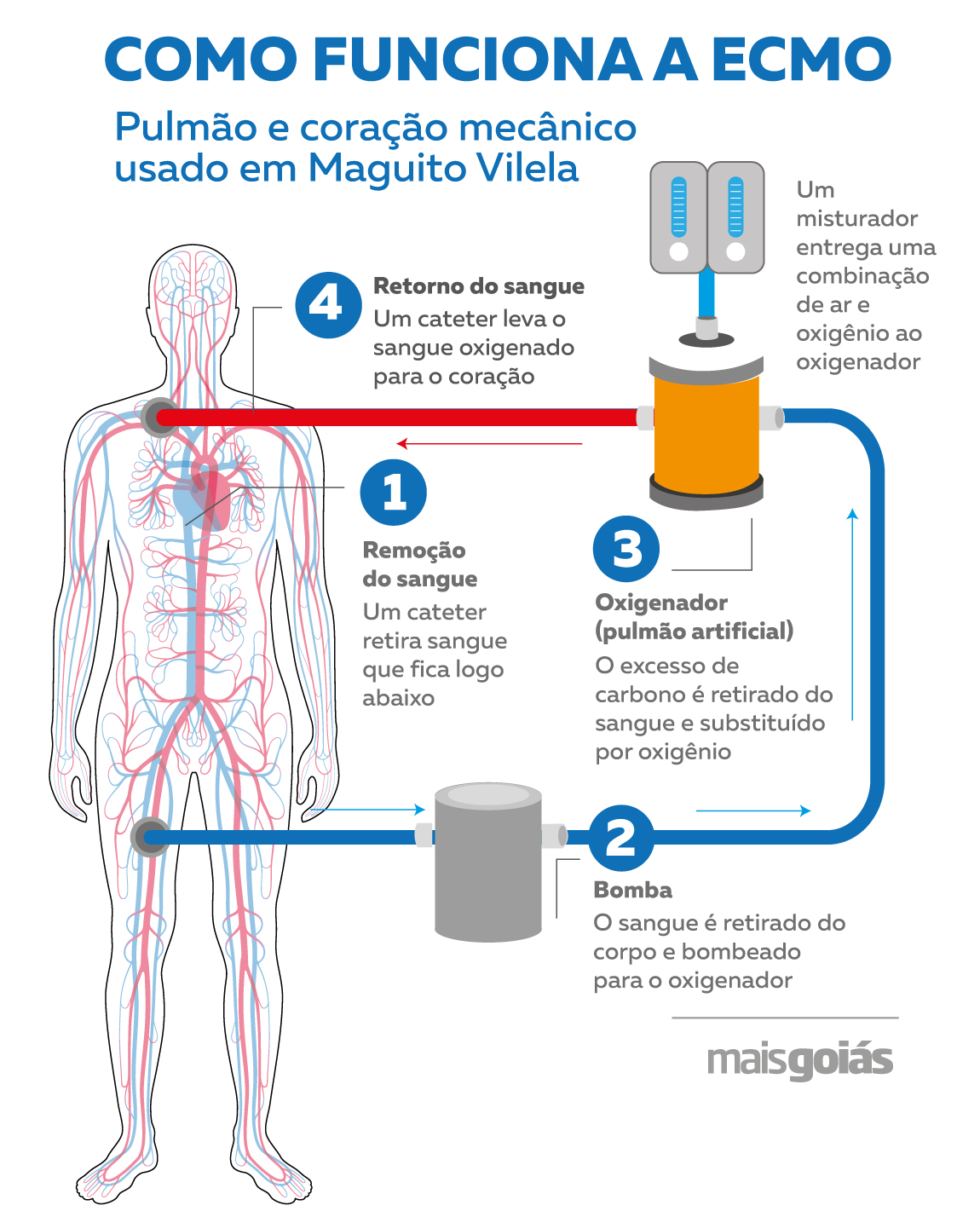 Agora, o emedebista foi submetido ao tratamento com uso da máquina ECMO (Oxigenação por Membrana Extracorpórea). O equipamento funciona como um coração e pulmão artificial ao paciente, usando um circuito de tubos, bomba, oxigenador e aquecedor que fica instalado fora do corpo. Assim, a máquina simula as funções naturais dos órgãos. Ela recebe o sangue do paciente, filtra o gás carbônico e devolve o sangue oxigenado ao corpo do indivíduo.