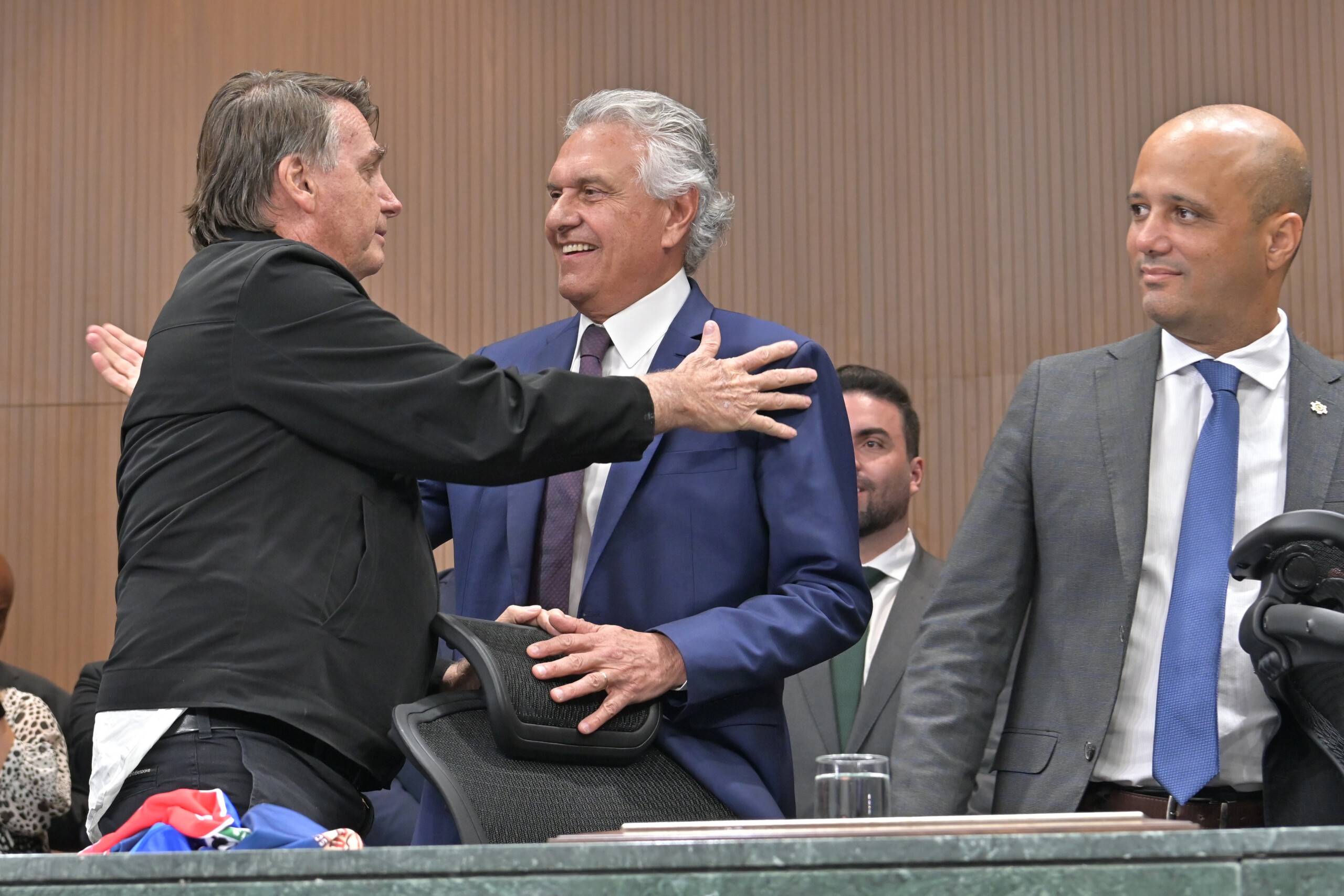 Bolsonaristas voltaram a fazer acenos ao governador Ronaldo Caiado (União Brasil) durante a cerimônia de entrega de título de cidadão goiano ao ex-presidente Jair Bolsonaro (PL), na noite desta sexta-feira (18), na Assembleia de Goiás.