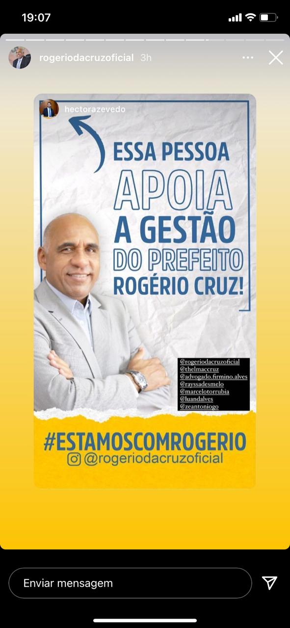 Preocupados com a repercussão que tomou a crise entre o MDB e o prefeito Rogério Cruz (Republicanos), o staff do prefeito está pedindo aos funcionários da Prefeitura de Goiânia para que postem em suas redes sociais pessoais um card com uma foto do prefeito com os seguintes dizeres “Essa pessoa apoia a gestão do Prefeito Rogério Cruz”.
