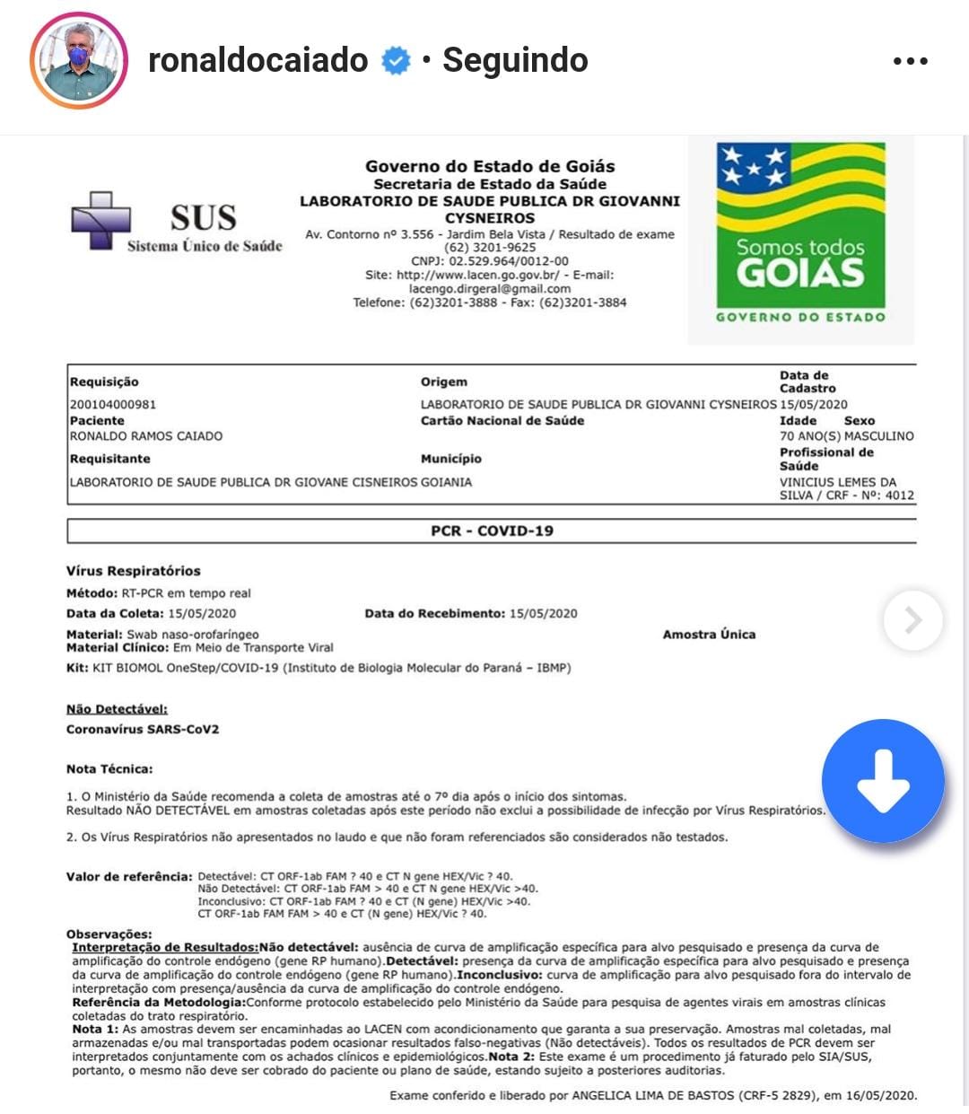 O governador Ronaldo Caiado (DEM) divulgou o resultado de seu exame do novo coronavírus agora há pouco em suas redes sociais. O resultado do governador deu negativo, mas de seu assessor de imprensa, Tony Carlo, deu positivo.