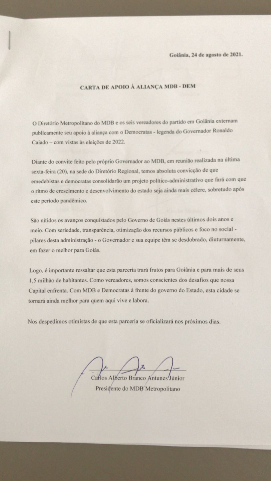 “O Diretório Metropolitano do MDB e os seis vereadores do partido em Goiânia externam publicamente seu apoio à aliança com o Democratas – legenda do governador Ronaldo Caiado – com vistas às eleições de 2022.