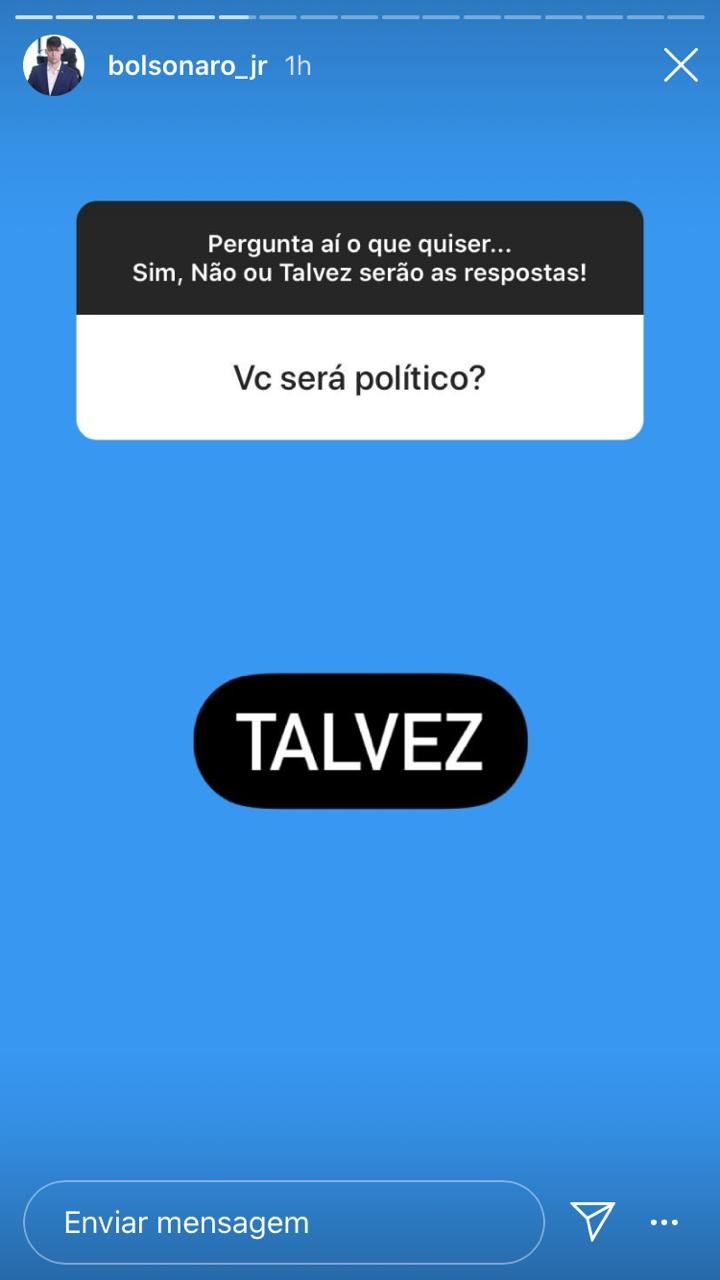 O filho mais novo do presidente Jair Bolsonaro, Jair Renan Bolsonaro, de 22 anos, deixou em aberto a possibilidade de investir em uma carreira política. Ao ser questionado por seus seguidores no Instagram se iria virar político, a resposta foi: ‘Talvez’. O senador Flávio, o deputado federal Eduardo e o vereador Carlos são seus irmãos mais velhos.