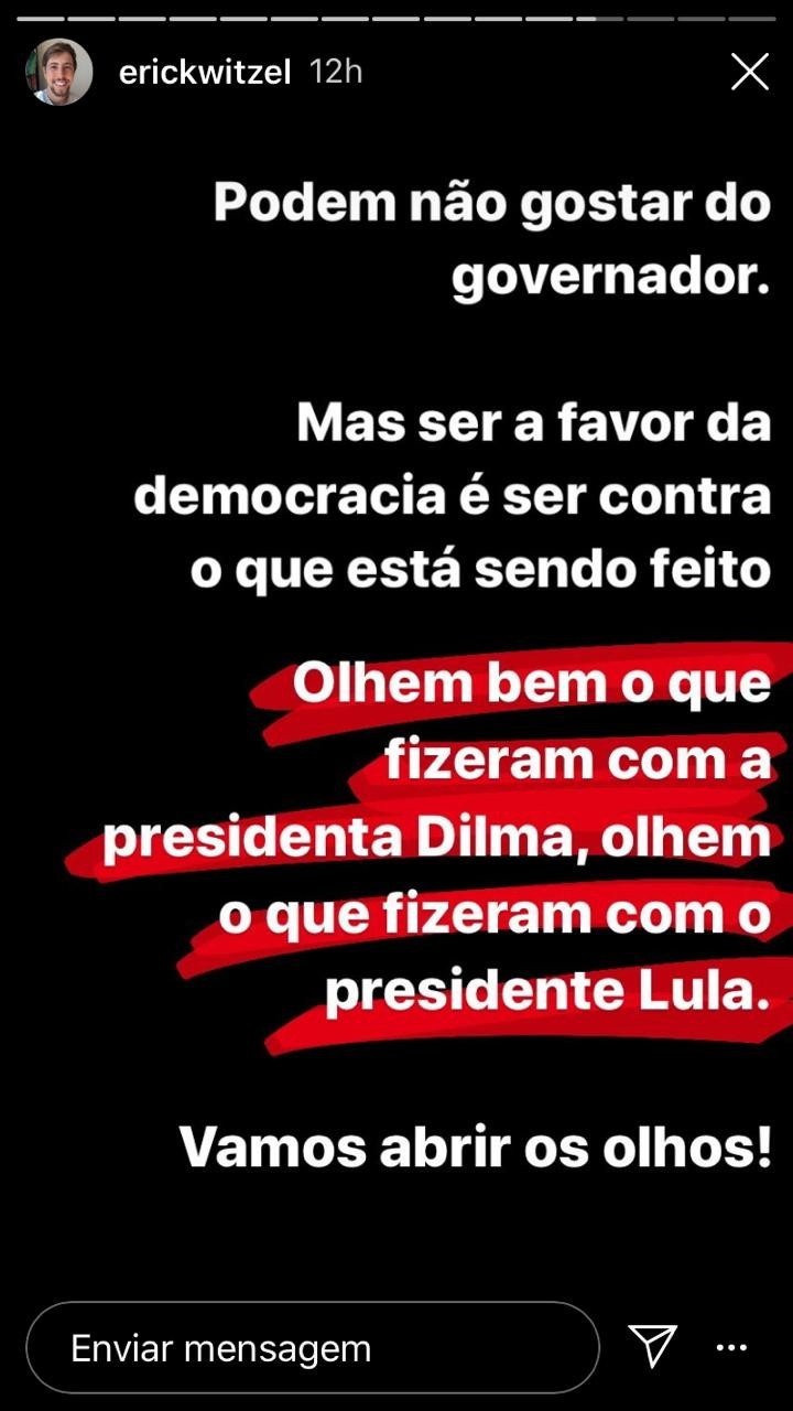 Erick Witzel, filho do governador afastado Wilson Witzel, citou os ex-presidentes Luiz Inácio Lula da Silva e Dilma Rousseff para defender o pai no Instagram. Nesta quarta-feira, dia em que o plenário do Superior Tribunal de Justiça (STJ) manteve o afastamento dele do cargo, Erick Witzel escreveu em seus stories: