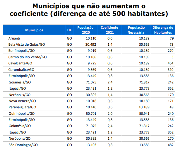 No País, 268 municípios ficaram próximos das mudanças do FPM, na faixa de até 500 habitantes. Em Goiás, destaque para Carmo do Rio Verde, que faltaram somente três habitantes. Além desta, Aruanã (79), Bela Vista de Goiás (73) e Paranaiguara (49).