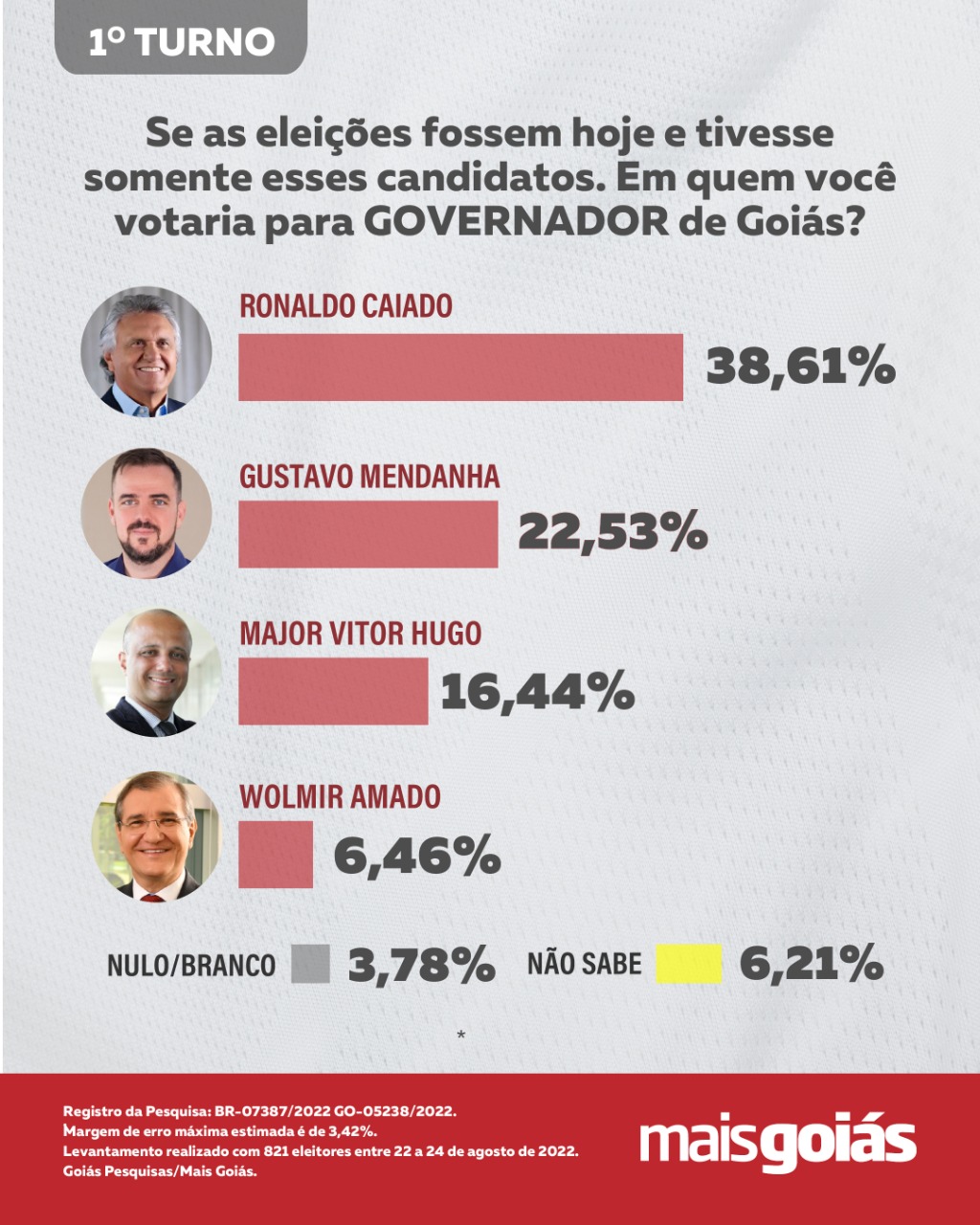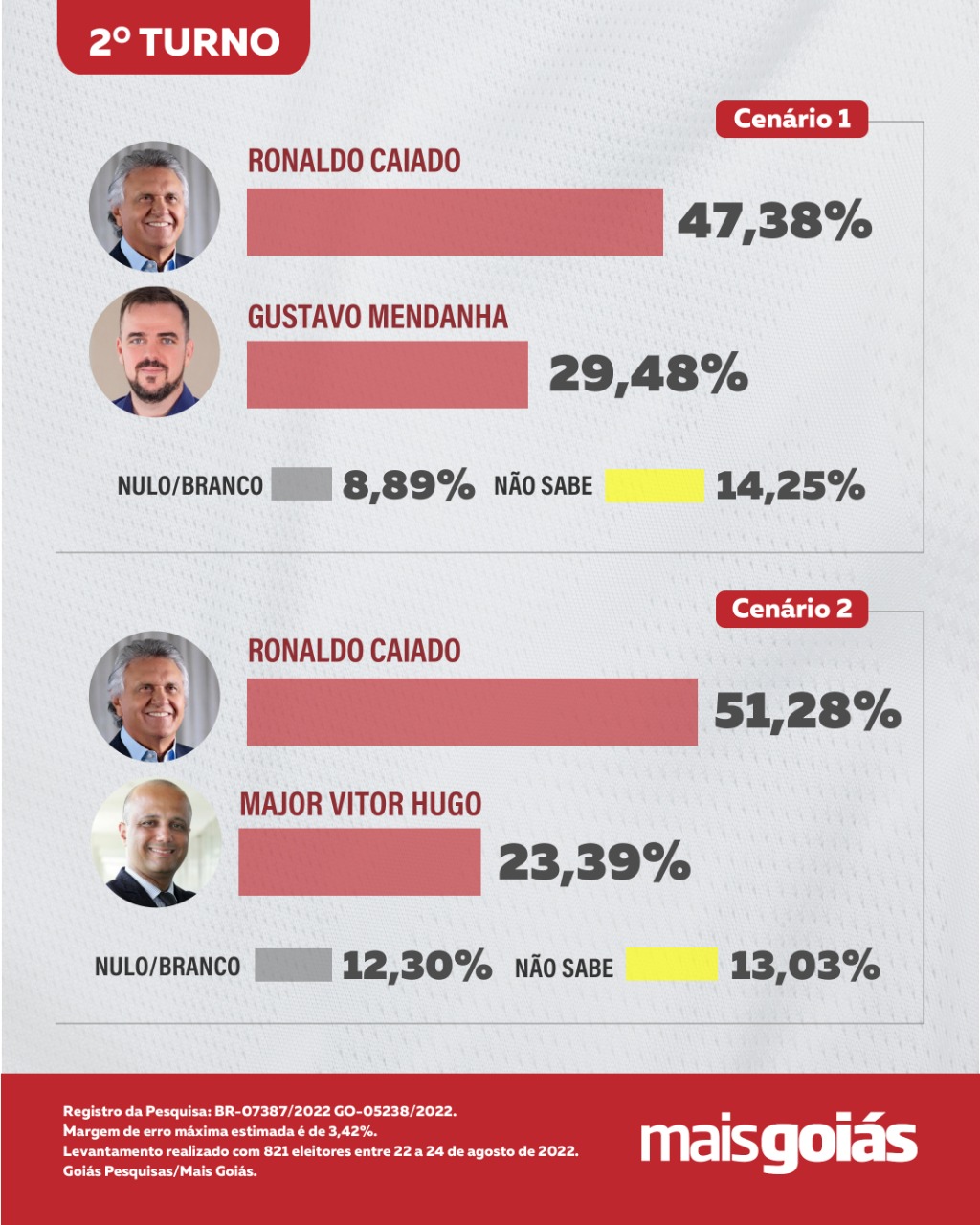 O levantamento Goiás Pesquisas/Mais Goiás ouviu 821 eleitores de 22 a 24 de agosto de 2022. A margem de erro é de 3,42 pontos percentuais para mais ou para menos e o intervalo de confiança é de 95%.