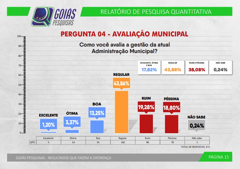 A avaliação positiva é a soma dos entrevistados que classificaram o mandato do prefeito como excelente (1,20%), ótimo (3,37%) ou bom (3,37%). A avaliação negativa se compôs pelo somatório de de pessoas que taxaram a administração como ruim (19,28%) ou péssima (18,80%). Não souberam ou não quiseram responder 0,24%.
