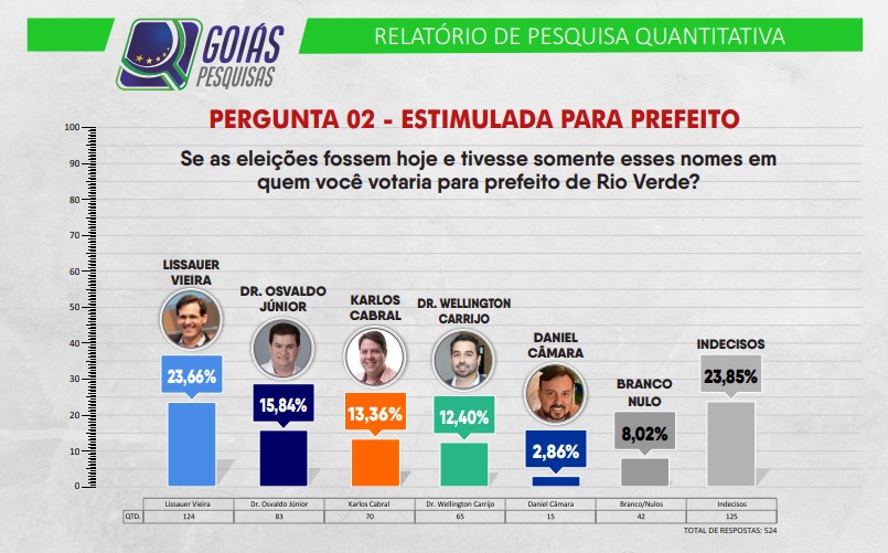 Goiás Pesquisas/Mais Goiás: Lissauer tem 23,6%, Osvaldo 15,8% e Karlos Cabral 13,3% em Rio Verde