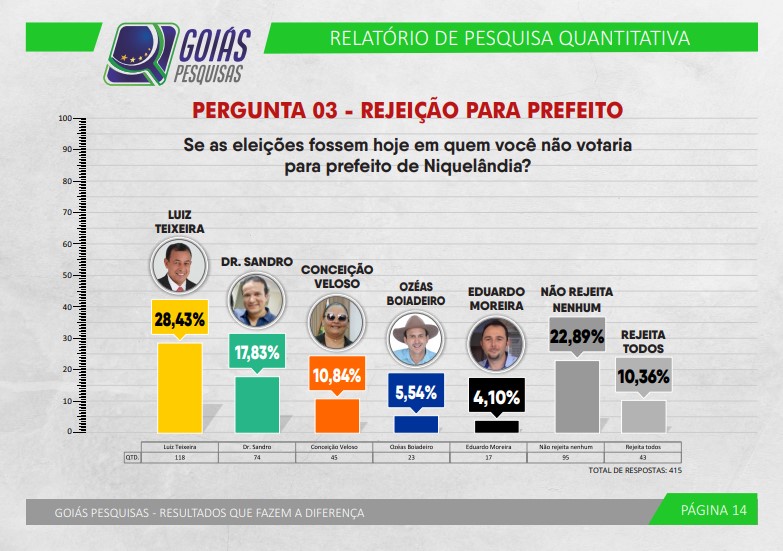 Entre os possíveis candidatos a prefeito de Niquelândia no ano que vem, o ex-prefeito Luiz Teixeira é o que tem a maior taxa de rejeição. A constatação é do instituto Goiás Pesquisas, que, por solicitação do Mais Goiás, fez um levantamento com 415 eleitores do município nos dias 19 e 20 de setembro. O percentual de entrevistados que não votam em Teixeira é de 28,43%.