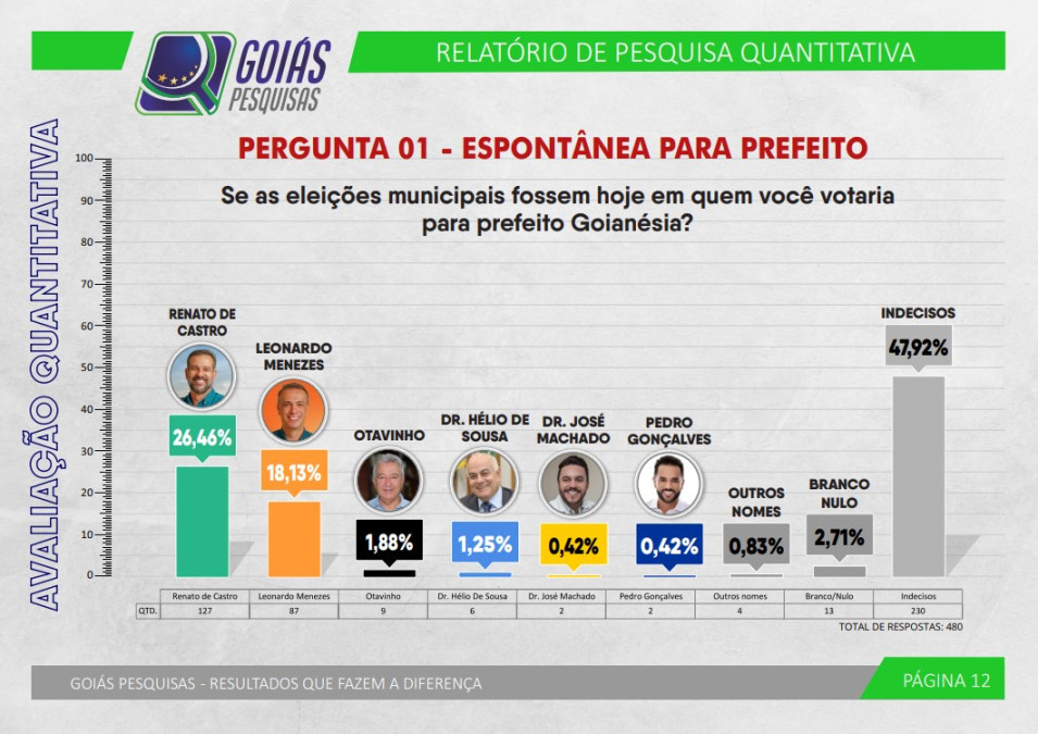 Embora seja de 28,96 pontos percentuais no cenário estimulado, a diferença entre o deputado estadual Renato de Castro (UB) e o prefeito Leonardo Menezes (UB) cai para 8,33 no quadro espontâneo da disputa pela prefeitura de Goianésia. É o que mostra levantamento feito pelo instituto Goiás Pesquisas nos dias 23 e 24 de agosto deste ano, a pedido do Mais Goiás.