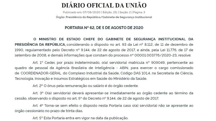 Pires é oficial de inteligência da Abin, o mais alto cargo da hierarquia da inteligência brasileira. Em 7 de agosto passado, três dias do agente ser nomeado para o Ministério da Saúde, Augusto Heleno, ministro-chefe do GSI (Gabinete de Segurança Institucional da Presidência da República), limitou-se a comunicar no DOU a cessão, por prazo indeterminado, do “servidor(a.) matrícula nº 909049”, da Abin, para ocupar o posto de coordenador-geral da CGCIS.