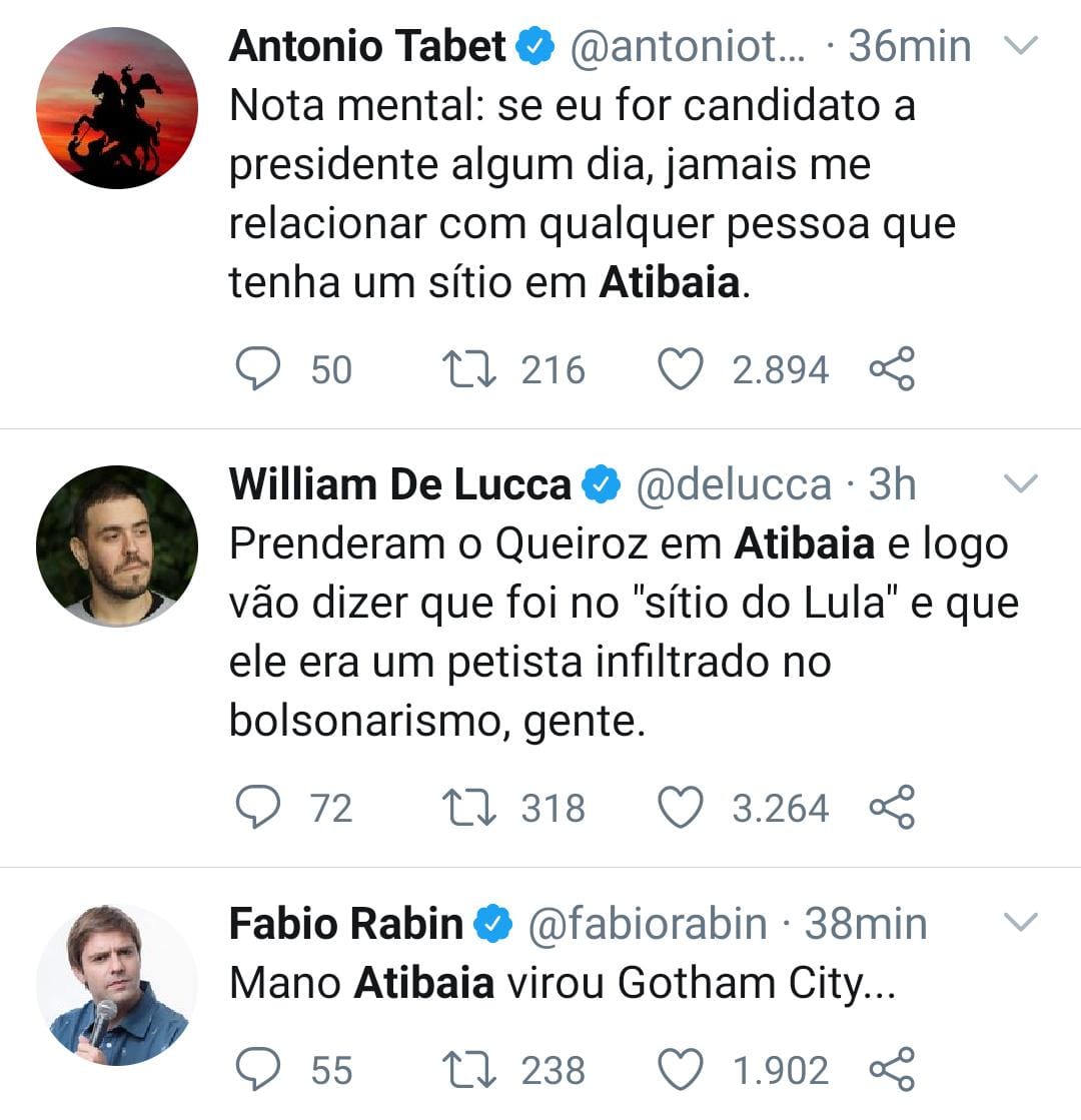 No entanto, a prisão de Queiroz na mesma cidade do Sítio do Lula foi motivo para que os internautas alfinetassem o novo “ponto em comum” entre os rivais políticos.