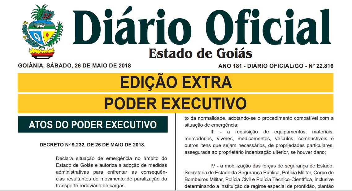 O governador José Eliton (PSDB) declara, por meio do decreto 9.232/18, situação de emergência no Estado de Goiás. A iniciativa, segundo o documento, foi adotada em decorrência de desdobramentos da greve dos caminhoneiros com intuito de garantir o abastecimento para o transporte de produtos e serviços públicos essenciais e identificar a repercussão da crise nos setores da economia local.