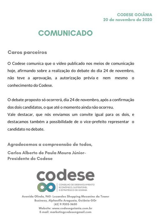A pedido da coligação do candidato a prefeito de Goiânia Maguito Vilela, a justiça eleitoral determinou que o também candidato Vanderlan Cardoso (PSD) pare de exibir o programa eleitoral em que anuncia um suposto debate entre candidatos a prefeito que seria realizado pelo Conselho de Desenvolvimento Econômico, Sustentável e Estratégico de Goiânia (Codese). O Codese já avisou que a realização do evento está condicionada à participação dos dois candidatos, mas Maguito está hospitalizado.