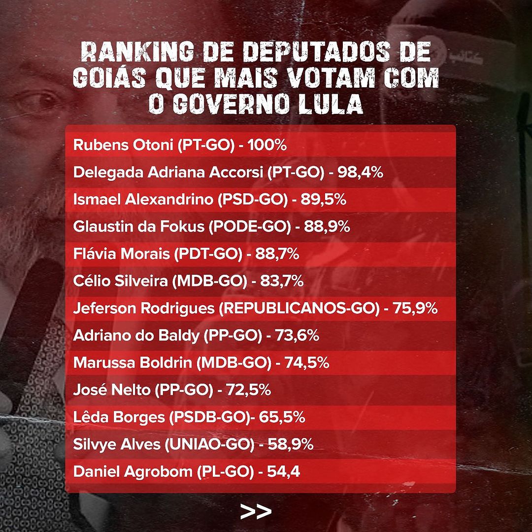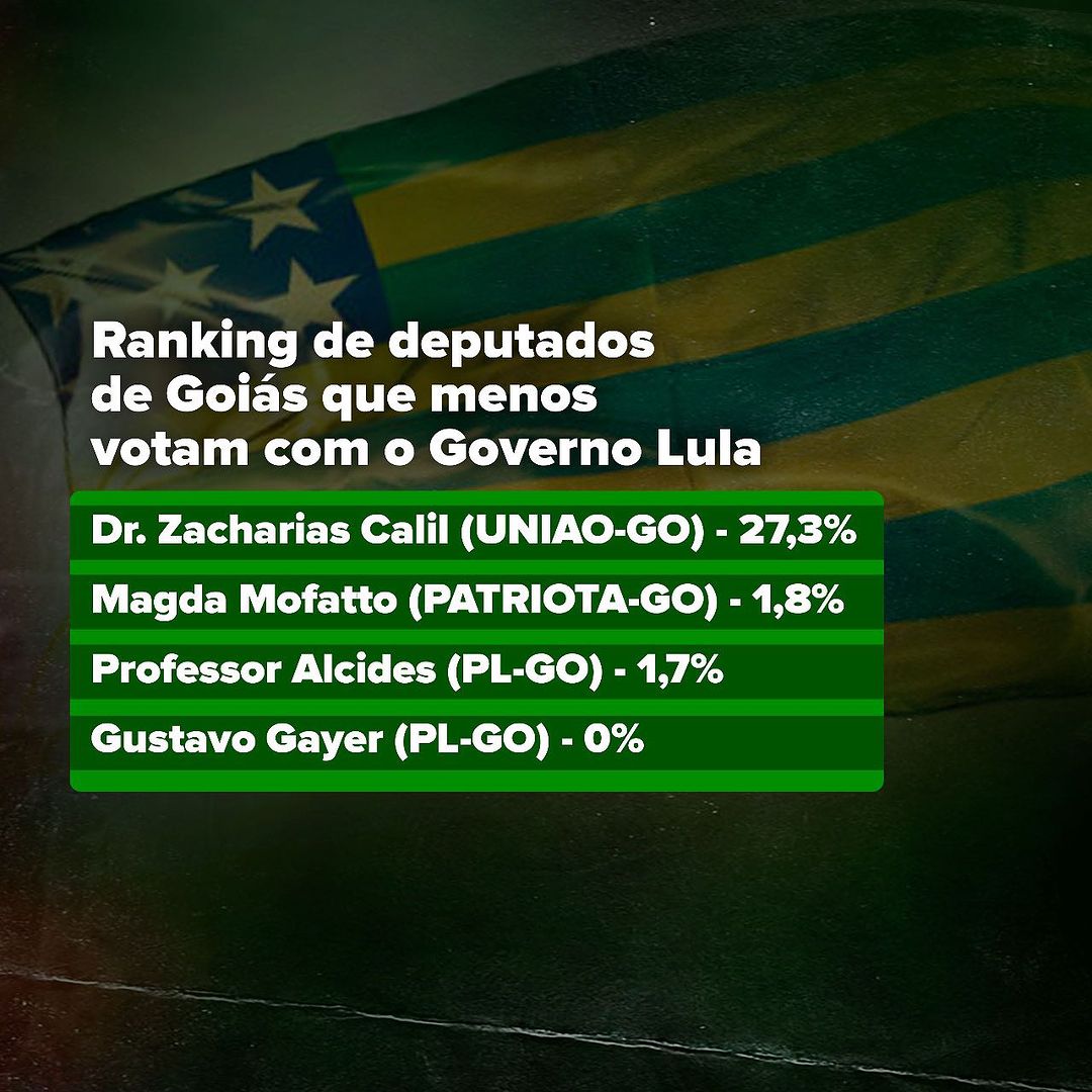 A deputada federal Magda Mofatto (Patriota) divulgou um ranking com os parlamentares goianos que mais votam com o governo Lula (PT) na Câmara. “A maioria dos que estão no card vermelho foram eleitos pela direita e, seis meses depois, votaram em sua maioria com a esquerda”, escreve na legenda.