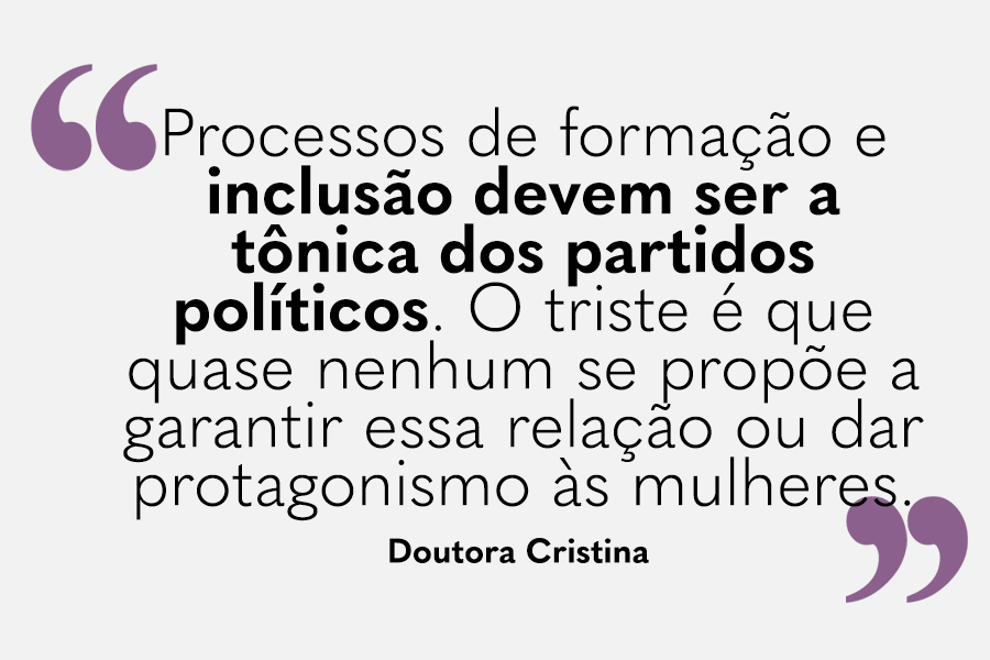 Outra defensora da mudança dos partidos em relação às candidaturas femininas é a pré-candidata a Prefeitura de Goiânia, a vereadora Cristina Lopes. Ela, que tem uma trajetória de luta em defesa das mulheres e já foi vítima de violência doméstica, afirma que falta vontade política em tornar as mulheres protagonistas no processo eleitoral. “Existem milhares de mulheres representativas, em todas as cidades do Brasil. Processos de formação e inclusão devem ser a tônica dos partidos políticos. O triste é que quase nenhum se propõe a garantir essa relação ou dar protagonismo às mulheres”.