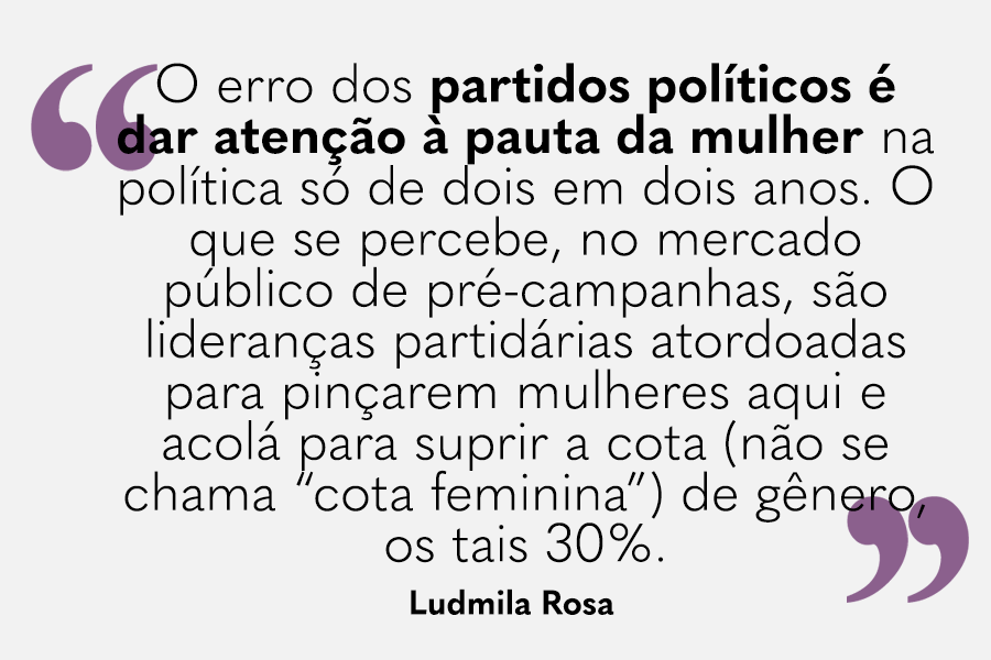 No que tange a cientista política Ludmila Rosa, um dos entraves que as mulheres enfrentam é o trabalho dos partidos em prol de suas candidaturas. “O erro dos partidos políticos é dar atenção à pauta da mulher na política só de dois em dois anos. O que se percebe, no mercado público de pré-campanhas, são lideranças partidárias atordoadas para pinçarem mulheres aqui e acolá para suprir a cota, os tais 30%”, explica.