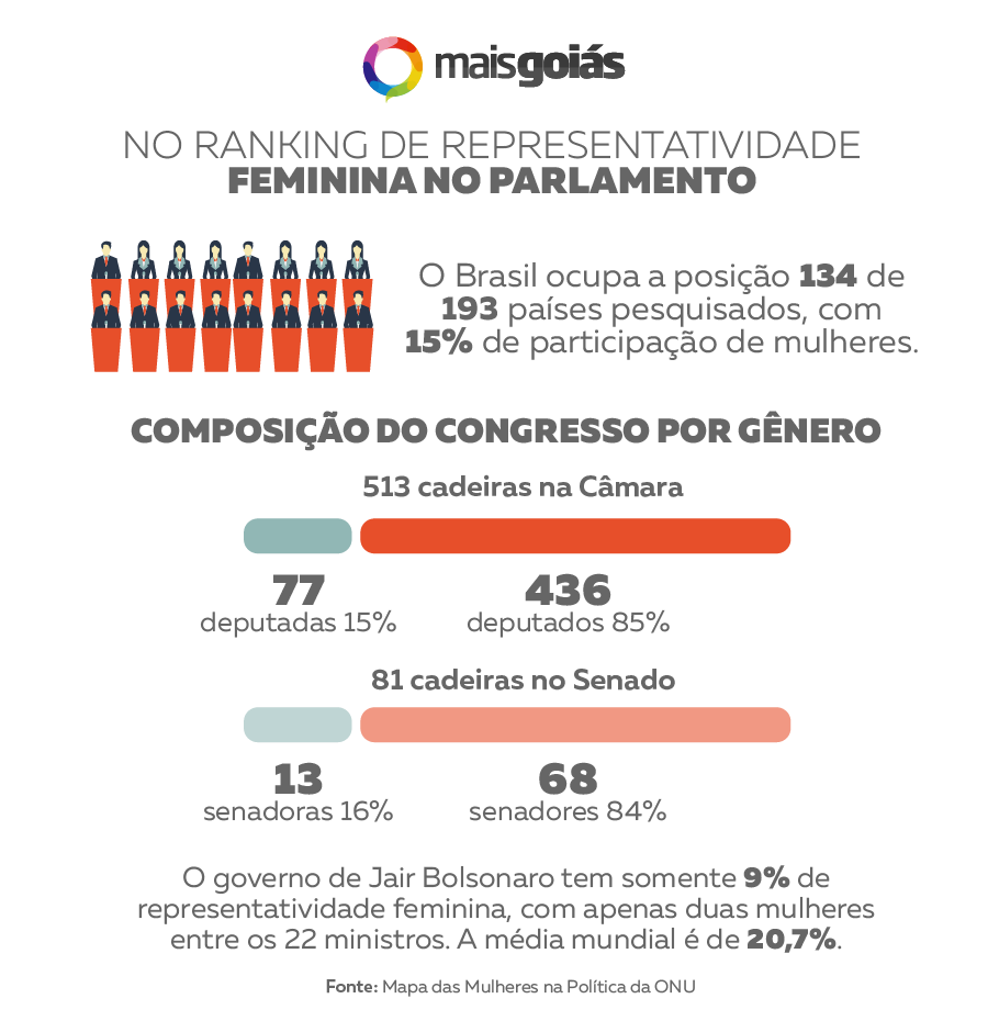De acordo com o Mapa Mulheres na Política 2019, um relatório da Organização das Nações Unidas (ONU) e da União Interparlamentar divulgado neste mês, no ranking de representatividade feminina no Parlamento, o Brasil ocupa a posição 134 de 193 países pesquisados, com 15% de participação de mulheres. São 77 deputadas em um total de 513 cadeiras na Câmara; e somente 12 senadoras entre os 81 eleitos.