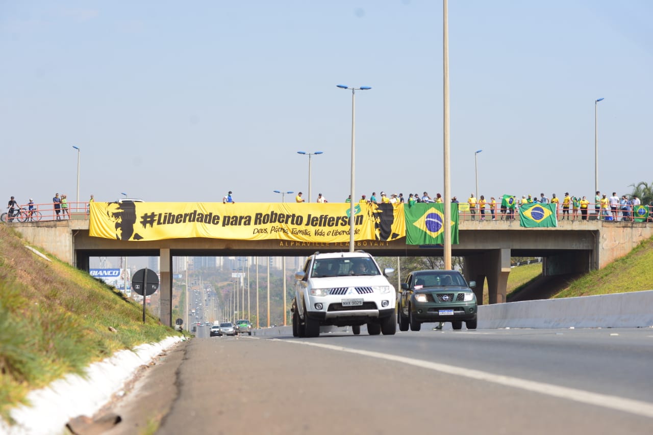 Durante o percurso, em um viaduto, manifestantes penduraram um cartaz pedindo liberdade para Roberto Jefferson, preso em 13 de agosto por determinação do ministro Alexandre de Moraes. Na segunda (6), o presidente do PTB foi levado a um hospital no Rio para tratamento médico – apesar de deixar a reclusão, ele continua em prisão preventiva e está com tornozeleira eletrônica.