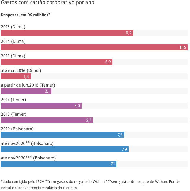 Neste ano, até o mês de novembro, o presidente desembolsou mais no cartão corporativo do que no ano passado. Ele gastou R$ 7,86 milhões, contra R$ 7,6 milhões em 2019, seu primeiro ano de mandato.