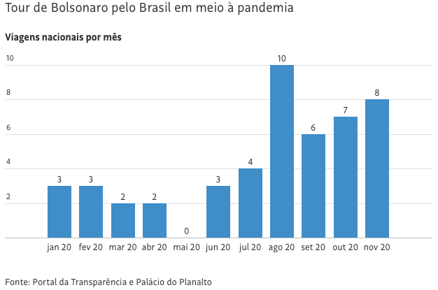 O aumento coincide com o início de estratégia do presidente de intensificar a agenda de viagens pelo país na tentativa de evitar nova queda em seus índices de popularidade. Como mostrou o Datafolha, a aprovação caiu no início da pandemia, mas se recuperou no segundo semestre.