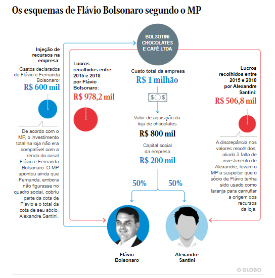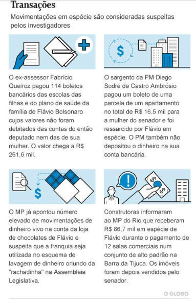 Em entrevista ao GLOBO, o senador confirmou que seu ex-assessor, Fabrício Queiroz, pagava mensalidades escolares e planos de saúde da sua família e que reembolsou em espécie um sargento da PM que pagou a parcela de um financiamento da sua esposa. Flávio nega irregularidades nas transações. Ele também nega que sua loja de chocolates tenha sido utilizada para lavagem de dinheiro, como suspeita o MP, e diz que a franquia é alvo de controle da matriz.