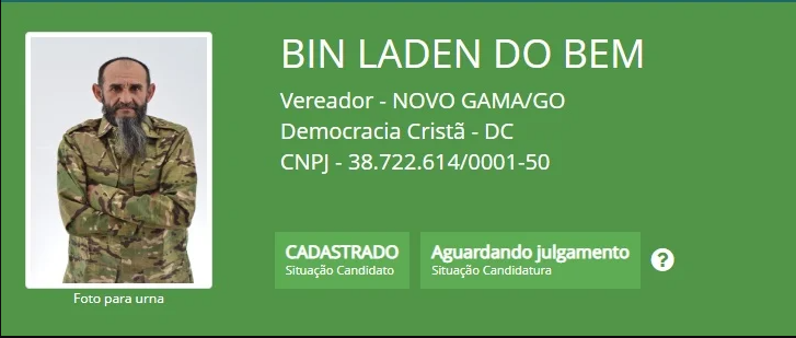 Bin Laden também aparece na disputa. Pelo menos não é o do mal. O do bem faria o quê?! Construiria Torres Gêmeas em Novo Gama, no Entorno do Distrito Federal. Tem que ver isso aí.