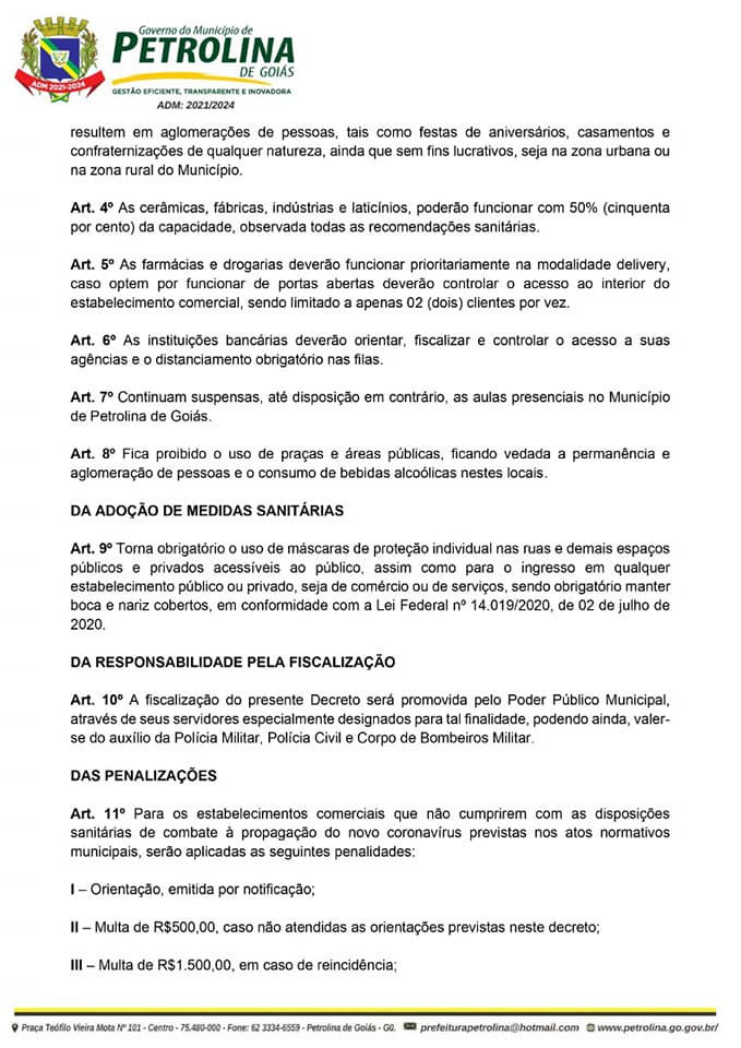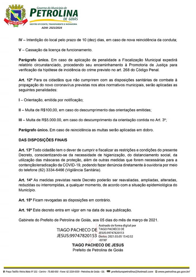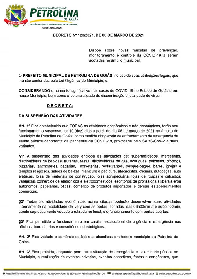 Thiago Pacheco, o prefeito de Petrolina de Goiás, cerca de 76 km de Goiânia, editou decreto na sexta (5) suspendendo por dez dias, contados deste sábado (6), todas as atividades econômicas e não econômicas, para combater a disseminação do novo coronavírus (Covid-19).