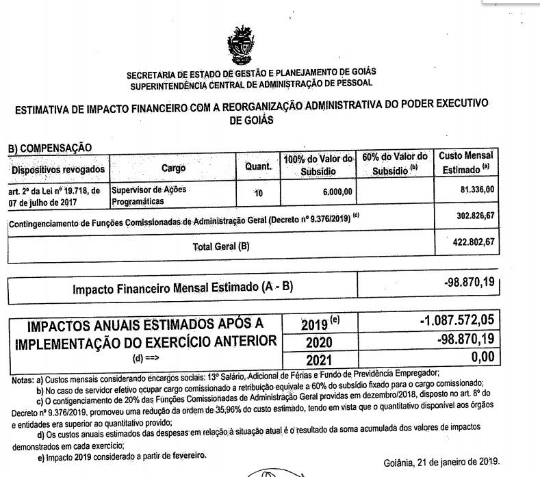 De acordo com o documento, assinado pelo governador, expresso no processo legislativo 178/19, a proposta estadual geraria um custo mensal de R$323.932,48, em razão da criação de novos cargos e órgãos públicos. A ideia é que o valor seja abatido pela demissão de comissionados, os quais representam gastos de R$ 302.826,67 por mês, e também pela exoneração de 10 supervisores de Ações Programáticas, que custam mensalmente R$ 81.336 aos cofres públicos. Assim, o total, subtraído dos gastos estimados com a reforma, geraria uma economia de R$ 98 mil. Veja: