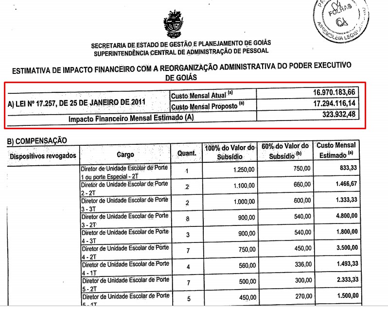 Porém, aprovar uma lei com base na possibilidade de demissão representada pelo decreto é considerado um risco pelo opositor Gustavo Sebba (PSDB). Ele defende que a reforma, por si só, não gera economia, mas aumenta o gasto público. De fato, o deputado é apoiado pela própria explanação de Caiado (veja abaixo), que estima um aumento do gasto mensal de R$ 16.970.183,66 para 17.294.116.14. “O que gera economia para o Estado é o decreto, até porque se demitir, vai economizar mesmo. O problema é que o governador pode começar cumprindo o decreto e depois revogá-lo, por conta própria – direito dele. Aí, ele poderá recontratar pessoas e o discurso de economia vai por água a baixo”.