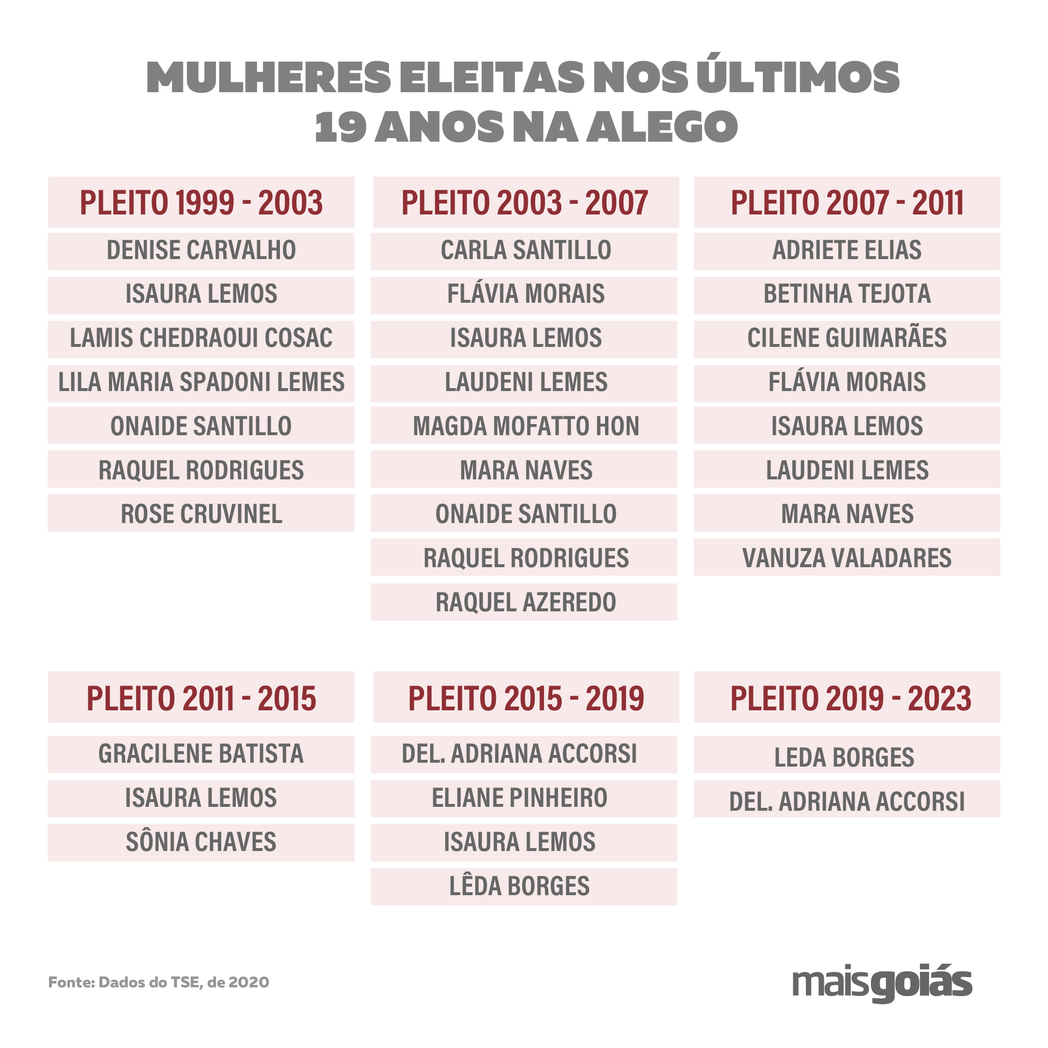 De lá para cá, houve regresso. Oito deputadas entre 2007 e 2011; três parlamentares entre 2011 e 2015 e quatro mulheres nos anos de 2015 a 2019. Atualmente, apenas duas deputadas – Lêda Borges e Adriana Accorsi – ocupam cadeiras na Alego.