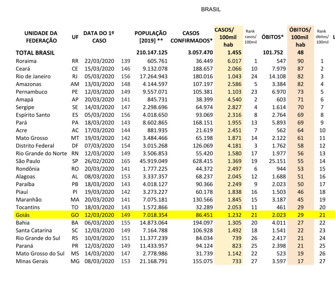Goiás e Ronaldo Caiado constam na quarta posição dos estados com maior número de “novos casos”, com 2.008 mortes. A lista é liderada por João Dória (SP), seguido por Romeu Zema (MG) e Eduardo Leite (RS). Ronaldo ainda aparece à frente de Rui Costa (BA).